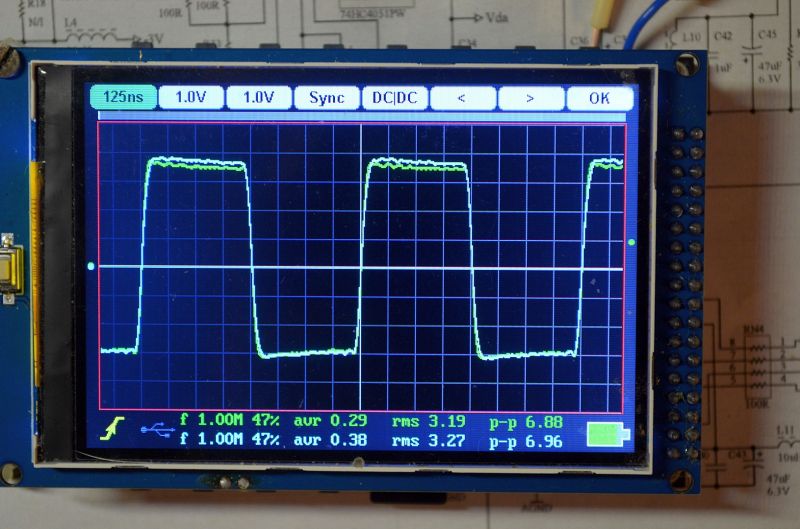 Theodoro, а как выглядит меандр на 1 МГц, у вас на нем был звон. Смещение в плюс у меня то же есть и наверно из-за китайского инвертора напряжения, заказал TPS60403 в ч и д, он теперь в соседнем городе, скоро получу и поменяю.
