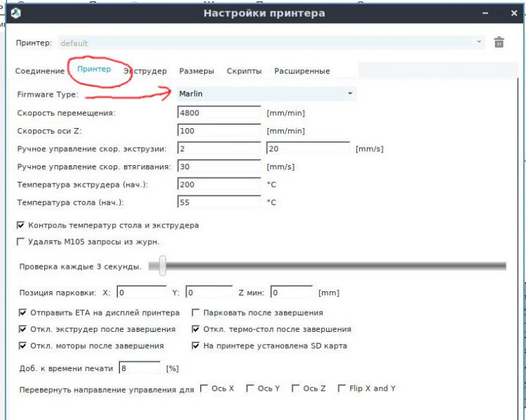 P.S. Пример работает для подключения самодельного принтера на Arduino Mega 2560 с прошивкой Marlin 2.0.6 к Repetier-Host 2.2.4. А так-то у меня и принтер другой, и работаю я с ним по WiFi, и слайсер Cura пользую ... Но помочь постараюсь, сам ещё не так давно через все эти грабли перескакивал