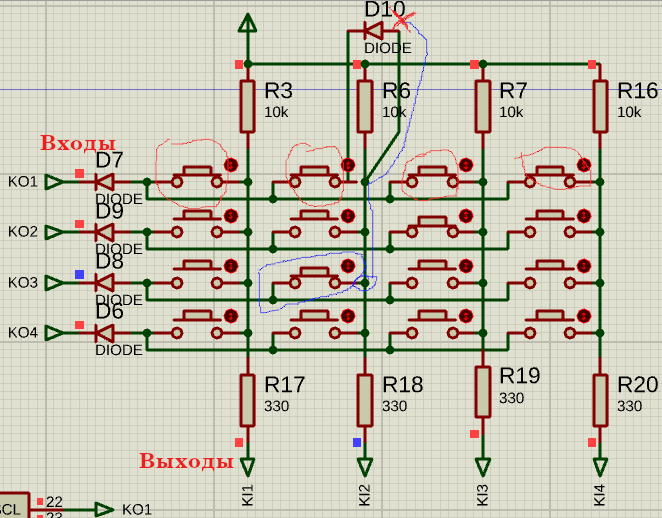 С другой стороны, если всё же оставаться на матричной клаве, то лучше инвертировать входы и выходы. Заодно и 6 тактов за цикл опроса на AVR(сейчас планирую делать проект на нем, а так только начинаю изучать STM) сэкономится.
