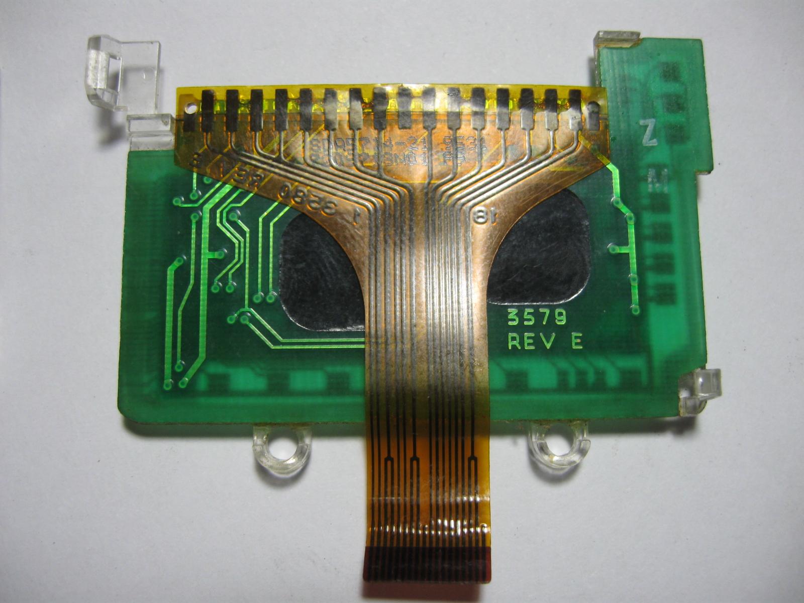 Вторая попытка была в отказе от встроенного контроллера, чтоб подцепить свой на какой-то аттини+сдвиговые регистры. Этому помешала конструкция. Сделано так: Сама матрица светодиодных криталлов сидит на 2-сторонней чёрной тонкой плате. На неё с задней стороны припаяны 2 чипа. В зеленой плате профрезеровано 2 окошка под чипы и они сверху залиты чёрной эпоксидкой. Платы между собой проклеены какой-то гадостью, что при разделении поотлетало большинство дорожек. При попытке срисовать схему самой матрицы выяснилось, что строки и столбцы между символами соединяются весьма хитрым образом(т.е. это не совсем обычная матрица получается). Плюс подпаяться и не поломать светодиоды проблемно. На этом свои издевательства над дисплеями решил прекратить и оставшиеся отложить до лучших времён.
