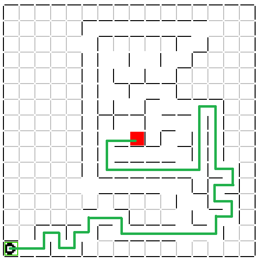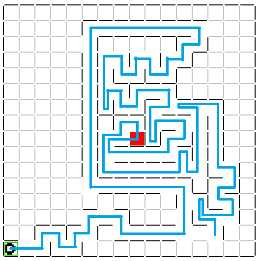 Так то робот используя алгоритм заполнения нашел финиш, а на обратном пути и кратчайший путь (не оптимальный!): СпойлерВот карта в составленная в памяти робота. Как видно, он не посетил левый верхний и правый нижний углы лабиринта.