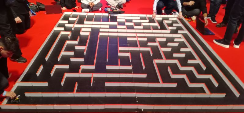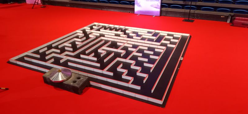 Когда приехали, лабиринт был закрыт и недоступен Поэтому возможности проверить на лабиринте сцепление колёс и калибровку сенсоров возможности не было. Открыли его только перед самыми соревнованиями: Старт находится в правом верхнем углу снимка, т.е. старт был не так как принято из левого нижнего, а из правого нижнего угла. Хорошо, что своему роботу я этот вариант предусмотрел - хоть тут не было накладок. Финиш в стандартном месте - ровно в центре. Хотя с другой стороны, в организации соревнований не было логики. Роботы оставались на руках у участников и, увидя лабиринт, можно было втихаря по-быстрому поменять фирмварь под этот лабиринт. Так же, лабиринт не был оснащен старт-стопными воротами - всё измерялось простым секундомером.