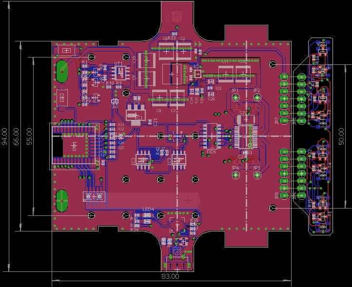 Вот только плата получилась у меня не сбалансированной - много компонентов с левой стороны и почти пусто - с правой. Возникла затея там же еще разместить USB разъём с CP2102, но выводов, куда подключить, у микроконтроллера больше нет. Хотя, можно попытаться последовательный порт шарить с интерфейсом отладки и программирования. Ведь, после, можно прошивку менять через BlueTooth.