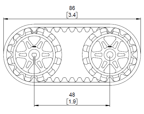 Шасси, что идет отдельно от роботов моторами не комплектуется. Готовые роботы (сборки не требующие) собраны с микрометал моторами с разными редукторами. В зависимости от коэффициента передачи достижима разная максимальная скорость. Для редукторов 1:100 - 0.5м/с, 1:75 - 0.65м/с, 1:50 - 1м/с. Но в ознакомительном видео, там же на сайте, упоминается, что для использования этого робота в соревнованиях LineFollower можно поставить моторы с редуктором 1:30. Ну, у меня как раз такие были, причем типа HPCB - High Power Carbon Brush, поэтому я планирую ставить именно их. Посмотрим, как быстро мне удастся их разогнать. Я надеюсь получить хотя бы 1.5м/с. На сайте pololu не нашел такой важной информации, как шаг робота - какое расстояние робот пройдёт выполнив 1 оборот ведущего колеса. Возможно, это каждый меряет для себя и по-своему. Для шасси Romi я использовал число, что указал Валвано в своём curriculum. Но тут можно попробовать воспользоваться тем что у нас гусеница напоминает зубчатый ремень - использовать решение именно для таких ремней. Когда-то я решал такую задачку сколько зубьев должно быть у ремня, подающего и приёмного шкива, чтобы расстояние между осей укладывалось в допустимый диапазон и вообще мог сущестовать в природе. В интернете такие калькуляторы тоже есть. Этим я занимался, когда привод экструдера на 3D принтере хотел перевести с шестеренки на ремень. Но, если подающий и приёмный шкив имеют одинаковое число зубьев - эта задача становится тривиальной. Итак, имеем гусеницу 22 зуба и два колеса по 12 зубьев. Ясно, что каждое колесо охватывет по 6 зубьев. 22 - 2*6 = 10. Значит, расстояние между осями равно 10/2 = 5 зубьев - 5 сверху и 5 снизу (что чертёж в даташите на эти гусеницы подтверждает). На том же чертеже указано расстояние между осями 48мм - значит шаг зубьев - 9.6мм. Ну а так как на колесе 12 зубьев, то шаг будет 9.6 * 12 = 115.2 миллиметра. А теперь можно вычислить теоретически возможную скорость. Возьмём, максимальные обороты двигателя 30000 об/мин, через редуктор 1:30 получаем обороты колеса 1000 об/мин, что за секунду будет 166.666 оборотов. Умножаем на шаг и получаем 1920 мм/с = 1.92 м/с.