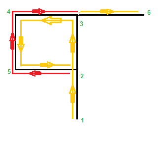 Теперь, когда есть движение, начал писать решение лабиринта. И снова, взял код с RSLK и повыкидывал все относящееся к движению и заменил на вызовы функции загружающие в очередь команды. После того как получил проход по лабиринту аналогчный RSLK (и даже лучше - по уже известным сегментам робот стал ходить в ускоренном режиме), решил добавить возможность срезать маршрут. Вот для примера простая петля. робот следуя из узла 1 в 2 видит развилку и выбирает, например, движение прямо. Далее следует по узлам 3-4-5 и снова оказывается у узла 2. По алгоритму люка-тремо, робот должен видя перед собой узел который однажды пересечен развернуться и ехать назад. Это показывает красная линия. Оказавшись снова у узла 2 - он уже не будет "однажды пересеченный", так как мы там уже побывали 2 раза. поэтому надо выбрать или проход, куда мы еще ни разу не ходили, или если такого нет, туда где были один раз. У нас есть проход в сторону узла 6 поэтому нам надо свернуть в ту сторону. Но, мы оказались там, где уже были и весь путь помеченный красным совершенно излишний. Поэтому, я хочу чтобы робот этот момент выполнял оптимальнее. Ну в таком тривиальном случае видно, что надо просто ничего не делать, а двигаться прямо. Но, если, допустим, другой вариант: В этом случае видно, что вместо того, чтобы разворачиваться и обходить "квадрат" по трём сторонам, оптимальнее повернуть налево и пройти только одну сторону. Вот с этими ситуациями и пытается работать мой алгоритм: вычисляет до куда надо вернуться и вычисляет кратчайший маршрут до той точки и перемещает робота туда. Одна из главных проблем была в том, что маршрут я составить то могу и передать на исполнение, тоже могу. Но как я буду знать, что он выполнен? Выполнен успешно? И вообще, где я нахожусь? Пришлось, конечно, помучаться, пока не удалось эти процессы интегрировать друг в друга. Пока есть уже рабочий код, который с моим домашним лабиринтом (из 9 узлов) вполне справляется заезжая с любого из трёх входов. Вот только хотелось бы еще сделать виртуальный "движок", чтобы посмотреть, как этот алгоритм работает на более сложных лабиринтах.