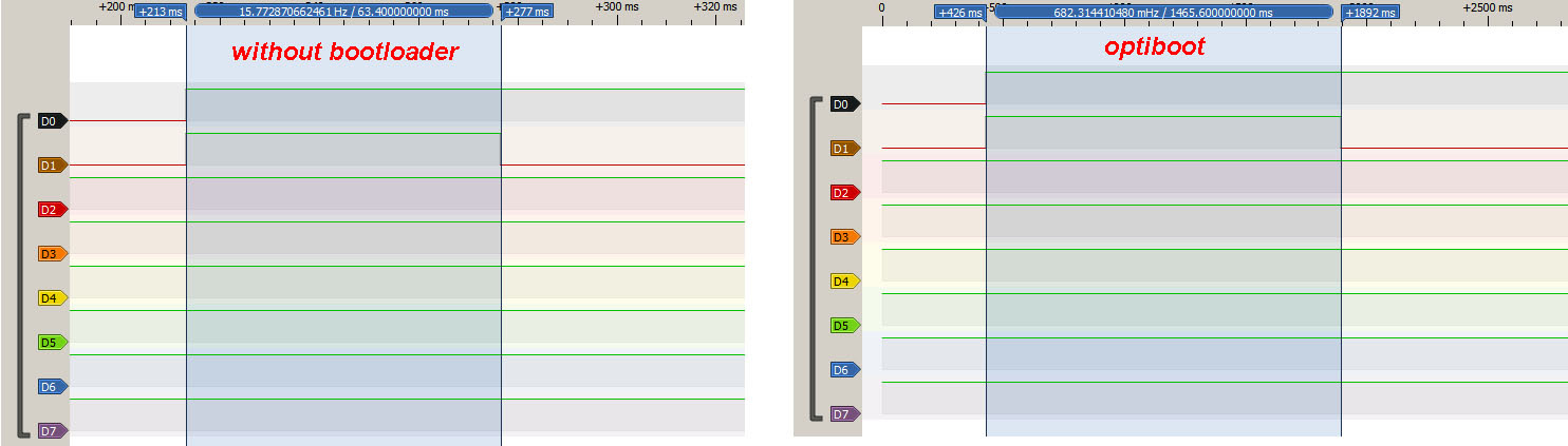 В замере логическим анализатором двух Nano (со старым загрузчиком и с optiboot) разницы также не обнаружил (без USB, напр. около ~ 1,5s при старте). (Наверное ускорение в других процессах). --- Решил записать и hex программатором USBasp (без загрузчика). Разница, как и предполагали, большая.