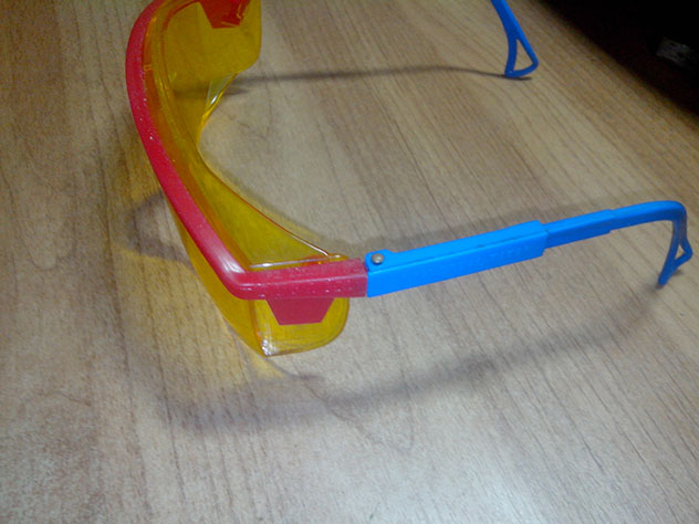 По поводу геометрической точности моего станка, что она не искажена. Недавно прикупил в магазине FixPrice - у нас это "все по 39 руб", вот такие желтенькие защитные очки для работы на станке Все хорошо, только уж очень они одноразовые! - моментально ломаются по переносице, буквально на второй-третий раз. Вырезал на станке усилительную дужку (коричневая сверху) П-образный профиль по 2мм каждая стенка и дуга соответствует дуге очков. Села внатяг как и рассчитывал, хотел ещё приклеить, но поликарбонат дужки не берет ни какой клей..... Прихватил парой мелких винтиков от какого-то винчестера Теперь можно сверлить-точить-паять-химичить строго по нормам техники безопасности!