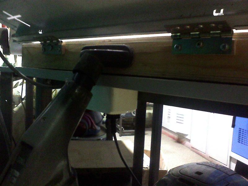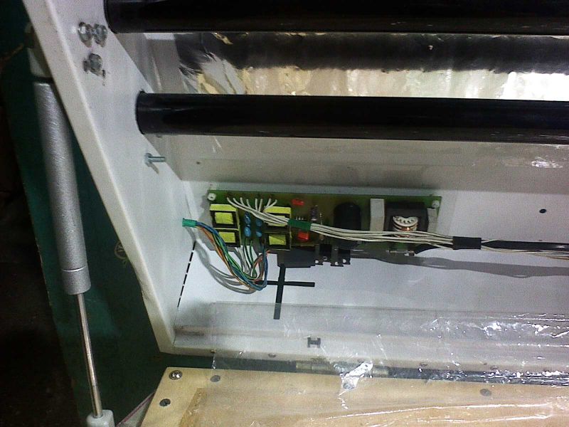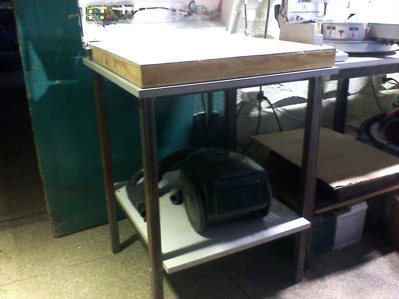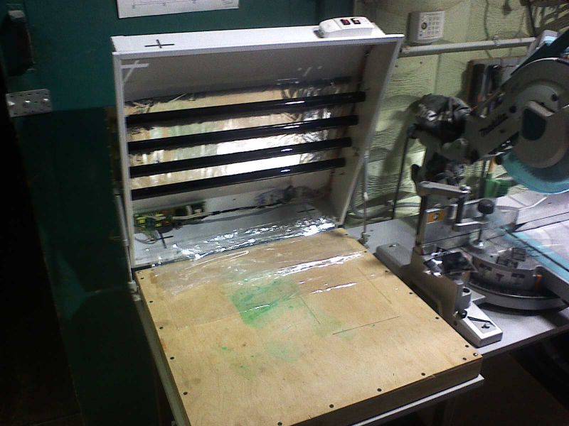 Выкладываю своего монстра. Полупромышленная установка - предполагалось делать большие платы. Размеры, что называется "от фонаря" - а именно от потолочного светильника, который был использован для экспонирования. Прижим осуществляется не настоящим вакуумом, а небольшим разрежением от пылесоса, посему абсолютной герметичности от конструкции не требуется, наоборот, нужен хотя бы небольшой подсос, с тем, чтобы мотор пылесоса мог охлаждаться.