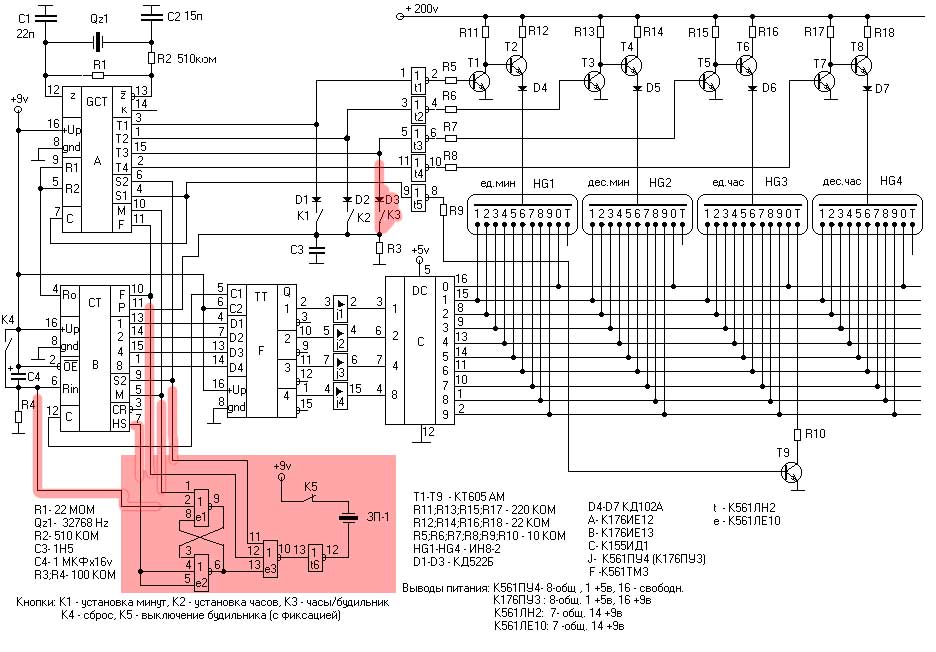 ...После почти года осваивания теории по электронным часам я сейчас приступил к разводке часиков по схеме от Рокла (1стр). Кстати, на ней у К561ПУ4 опечатка - напротив 15 ноги должна быть (на схеме) 14, а не 4.