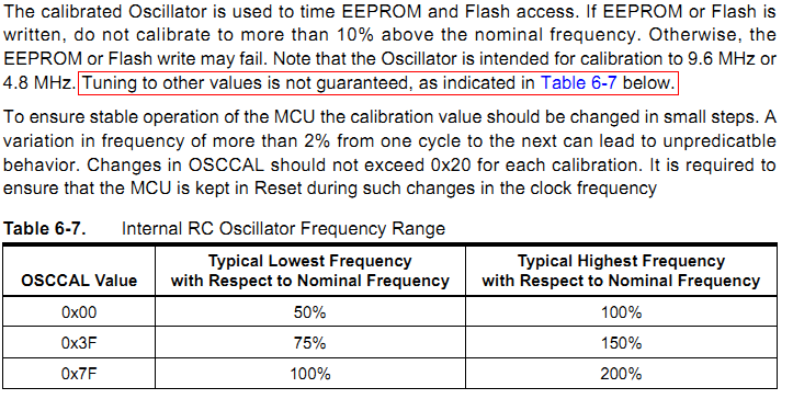 И ещё вопрос по таблице из datasheet: Как для одного значения регистра OSCCAL может быт такая большая разбежка в процентах, к примеру для $7F 75% 150% и что означают эти проценты, как их высчитывать????