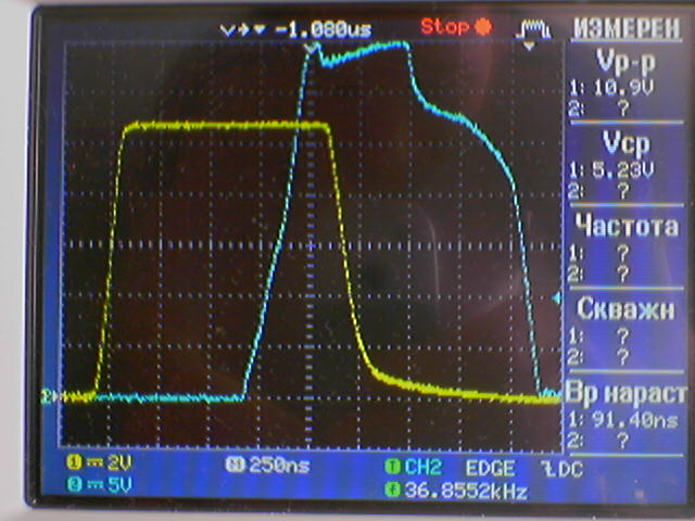 для сравнения, задержка на IR2104 Задержка, желтый - выход 494-ой, синий - затвор верхний мосфет задержка сигнала = 750 ns, сокращение длительности сигнала - нет