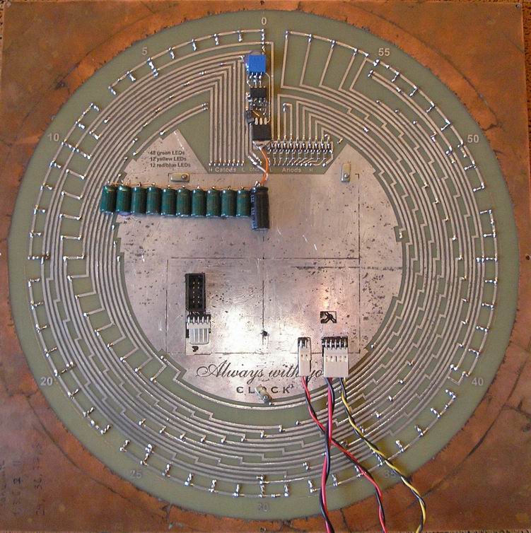 Дополнительные индикаторна термометра подгрузили немного каскад дыммера, пришлось из старой мамки надергать батарею конденсаторов 1000мк/6,3В и добавить на выход дыммера. В итоге пропало паразитное мерцание на самой малой яркости (в темноте). 8мм светодиоды на часовых метках не подошли-сильно слабее яркость относительно 5мм. Поэтому поменяю все 8мм на 5мм как только доберусь до магазина.