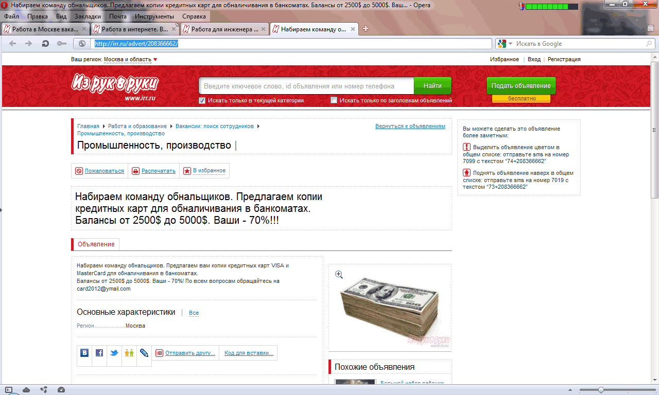 Yahoo , в домене европы.... Да при нормально работающих правоохренительных, первым - ну вторым, если не мгновенно работник упраления успел бы ответить на объявление, был бы агент и очень быстро посадили бы всех. А тут спокойно висит объява. А может это fake или наоборот сами органы разместили ?