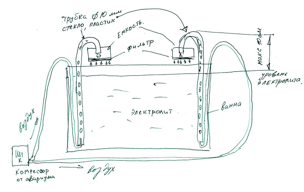 Можно поставить 2 таких с обеих сторон ванны, в результате будет выполнено 2 условия, фильтрация и равномерное перемешивание электролита.