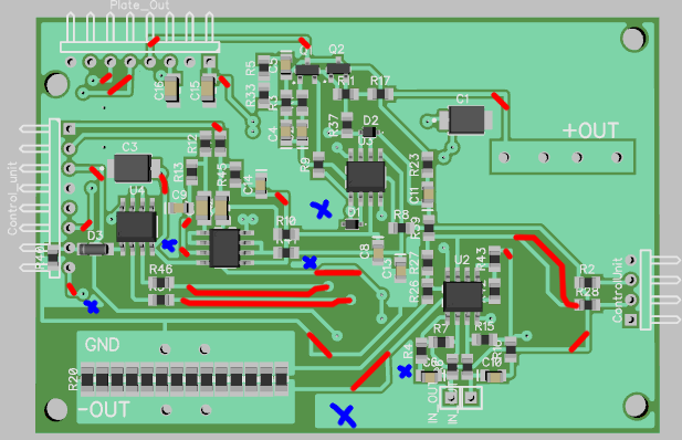 По поводу одновибратора: когда стабилизатор переходит в промежуточное состояние ( переключается СС-СV) светодиоды и так переключаются с довольно большой частотой и визуально это выглядит как одновременное свечение светодиодов. Причем яркость разная, к какому режиму ближе тот и ярче. Одновибратор нужно пробовать на практике, как это получится. Ну а разводка, то помимо исправления сугубо моих ошибок (ошибка на схеме-> ошибка на плате) хочу сократить длину силовых дорожек. У меня на плате шириной 80мм силовые цепи проходили через всю плату, от клемм вход, до клемм выход, хочу сократить длину проводников. Еще хочу переделать: снимать напряжение отдельным проводником прямо с клеммы "+" на передней панели, напряжение для усилителя тока так-же с клемы "-" и общей точки Ground на плате выпрямителей. А в остальном, силовая и слаботочная земля у меня выполнены отдельными проводниками с каждой платы и соединены в одной точке на плате выпрямителей, исключение AGND, который с платы усилителей идет на плату управления и там соединяется с GND возле микроконтроллера. Ну и можно уменьшить размеры плат, первоначально не очень стремился к минимальности, больше рассматривал как макетку. Да и односторонние они у меня, много просто еще есть одностороннего текстолита , это "-" - много перемычек.