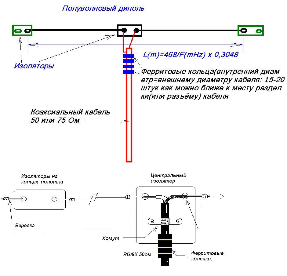 А если лень возится с противовесами, то можно вертикальный коаксиальный диполь сделать. Удобно закрепить на китайской 6-7 метровой удочке. Дёшево и сердито. В качестве нижнего вибратора можно использовать трубку подходящего диаметра, внутри которой будет проходить коаксиальный кабель. Если нижний вибратор будет иметь больший диаметр чем верхний, то его следует сделать на несколько сантиметров короче верхнего. Антенну можно приспособить для использования в. походных условиях. В этом случае верхний вибратор выполняется из гибкой многожильной проволоки, а в качестве нижнего используется гибкая металлическая оплетка, надетая на защитную оболочку питающего коаксиального кабеля. Растягивая или сжимая металлическую оплетку, можно добиться оптимального согласования антенны с питающим кабелем. Антенну можно изготовить целиком из коаксиального кабеля. Для этого с кабеля на расстоянии около 3 м снимается защитная оболочка, а оплетка сжимается, выворачивается и натягивается на нижнюю часть кабеля. Затем верхняя часть антенны укорачивается до требуемого размера и производится настройка антенны путем растяжения или сжатия нижней части диполя.