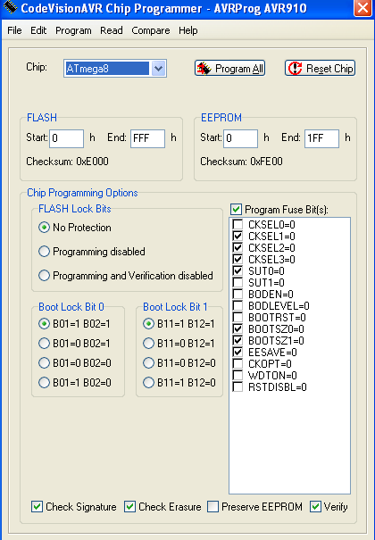 P.S. Единственное что смущает, так это то, что в CVAVR при проверке сигнатуры выдаёт фьюзы 0x1E 0x93 0x07 вместо Lock Bits = 0x 3F; High Fuse = 0x D1; Low Fuse = 0x E1; Ext. Fuse = 0x 00, указанных в статье (я так понимаю тут High Fuse = 0x D1 не совпадает). Почему не знай, вроде биты правильно выставил.... Ниже скрин из CVAVR.