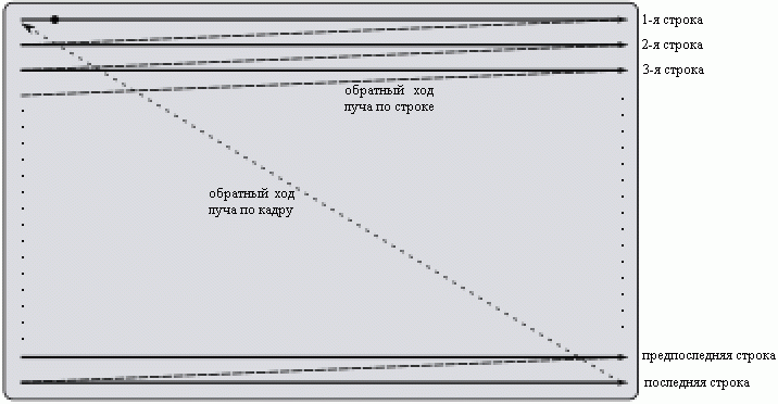 Как видно из рисунка, луч на экране движется слева направо, строки сменяют друг друга сверху вниз. При этом на экране получается устойчивое изображение, даже если частота строчной развёртки будет отличаться в некоторых разумных пределах от стандартной – в 15625 Гц.