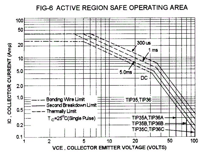По поводу конденсатора - понял. По поводу каскадов на Q4 Q2 - что можно сделать? Вводить дополнительные цепи коррекции? Я плохо разбираюсь в этих вещах. На выходе хочу получить максимум 15В. Как определить, возможен ли вторичный пробой при заданных условиях? TIP35C позволяет рассеивать 125Вт, а максимальный ток коллектора 25А. добавлено: Вот SOA транзистора TIP35C. Я правильно понимаю, что мы попадаем в безопасную зону при напряжении К-Э 28В и токе 2А ?