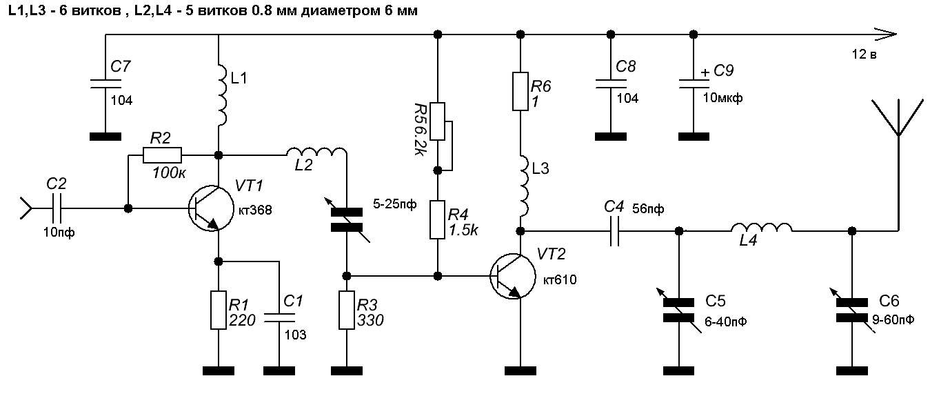Вот на двух транзисторах. Схема стандартная и никакой новизны в ней нет. Схема подобна, что в статье на форуме http://radiokot.ru/circuit/analog/receiv_transmit/07/ Только устранены некоторые неточности и применены другие транзисторы. Вместо древнего p-n-p транзистора П416 поставил КТ368 (КТ316, КТ325) Питание 3 вольта. Стабильность конечно не очень. За антенну хвататься нельзя. Когда за антенну хватаешься, частота уходит на 3 мгц. Чувствительность по микрофону хорошая. Наверное это из-за применения транзистора КТ3102Г.