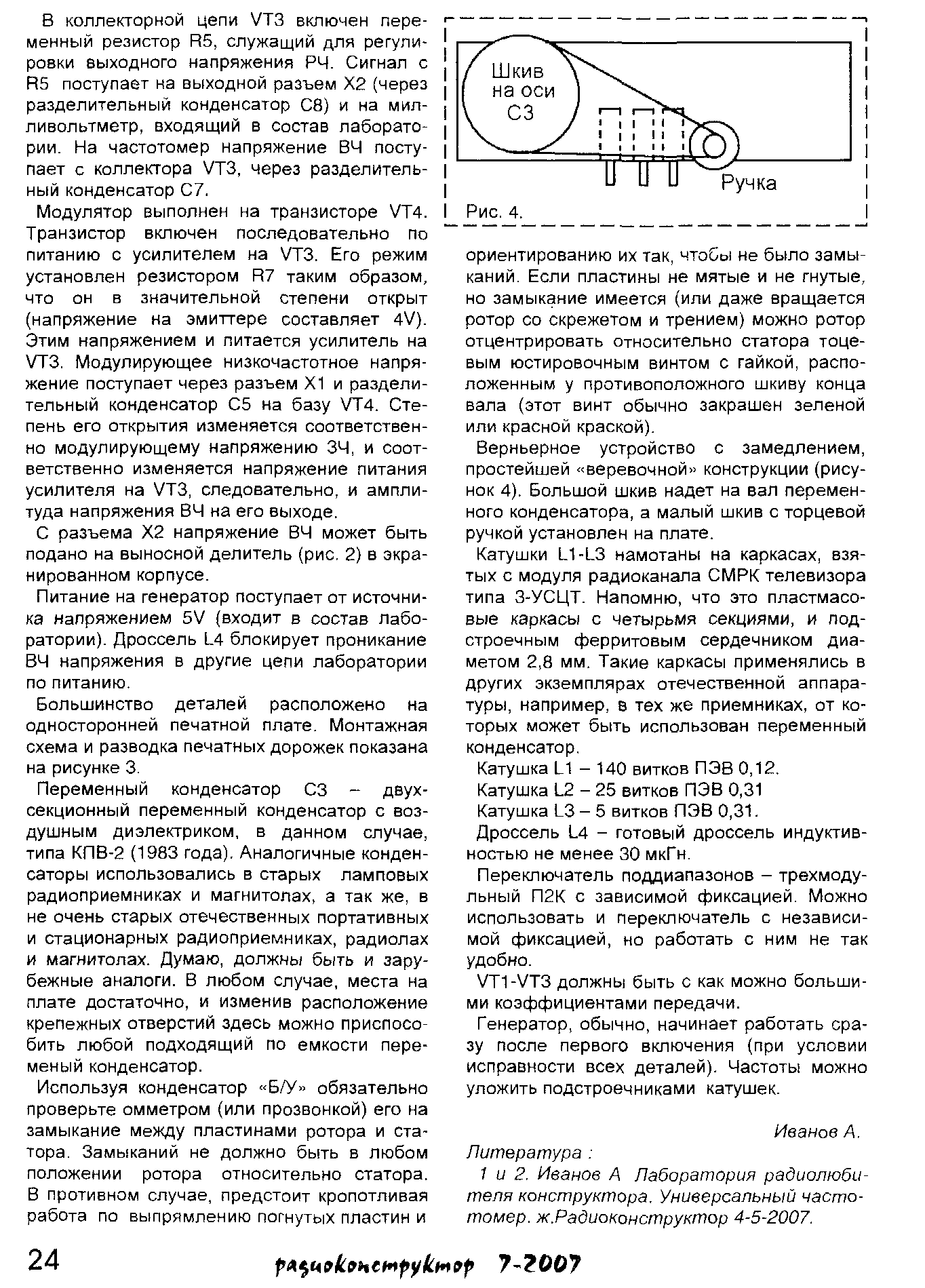 Здравствуйте! Собрал генератор ВЧ по схеме Иванова А. Опубликованный в журнале радиоконструктор 2007-07. Но работает не так как описано в статье, к примеру: первый диапазон от 0,3 до 2 МГц, но в реальности частотомер показывает от 400 кГц до 550 кГц (перепроверял осциллографом), т. е. Получается диапазон «сужен» и так на всех режимах. В схеме явно есть опечатка, перепробовал многое, менял сопротивление резисторов R1 и R2. Положительным результатом дало увеличение сопротивление R1 до 20 кОм, в этом случае генератор на первом диапазоне начинает работать с частотой от 600 кГц до 2 МГц. На остальных диапазонах соответственно происходит также, но с увеличение частоты сигнал практически падает до нуля, на частоте 16 МГц он составляет менее 1 мВ. Пробовал даже у транзисторов VT1 и VT2 поочередно менял коллектор с эмиттером, на работу генератора это не повлияло. Добавлял/отматывал витки на катушках, использовал другие типы катушек, не помогло. Транзисторы подобрал с самым большим коэффициентом усиления (500), уже поставил КТ3107 с буквой Ж. Явно что то не так в схеме соединений генератора. Интернет ничего не дал, указаний на опечатку в схеме нигде нет. Какие будут предложения? Вызывает сомнение несимметричного мультивибратора на VT1 и VT2. P.S. С этой схемой бьюсь 3 день, тут уже просто разбирает любопытство.
