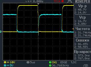 Задержка драйвера (синий вход драйвера/вых. PWM-контроллера, желтый выход ключей/вход дросселя):