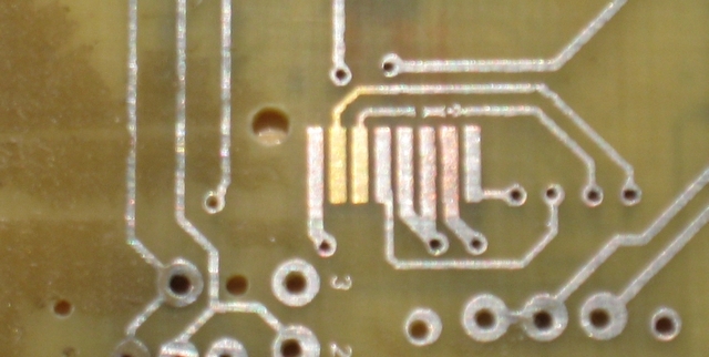 Хотел попробовать золото по химникелю, контактные площадки для дисплея 3310. Никель при комнатной температуре не идет никак. В нагретом до 80 гр. электролите все прекрасно покрылось. Затем стал пробовать нанести золото тампоном, но допустил глупую ошибку, перепутал анод с катодом , в результате стравил никель на некоторых площадках, стал понимать что происходит когда стала показываться медь. Но все-таки решил продолжить эксперимент, покрыл пару площадок, хвастаться особенно нечем, но покрывается хорошо, водил тампоном секунд двадцать, грубой губкой с пемолюксом не стерлось. Одна площадка по меди, вторая по остаткам никеля, блестит лучше.