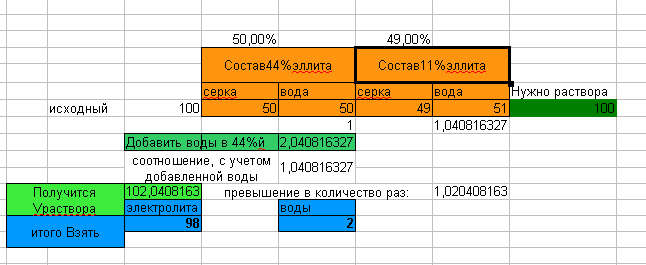 savvey а в моём случае, если плотность на бутылке написано 1.42(специально покупал с бОльшей плотность)... получается на 100 гр добавить где то 430 гр воды ? (1.42 плотность - грубо 50% серки), при 100 граммах эл лита в нём 50 гр серки, 50(гр. серки в исходном) * 11(гр. серки в требуемом) / 100(исходный масса)= 500гр -100(гр - исходная масса) = 400 гр воды ? (интересно, почему у меня 354 получилось...) получим в итоге пол кило раствора, нам нужно всего примерно 250 гр, получаем нужно взять 50 гр 50% раствора серки и 200 гр воды, получим 250 гр 11% раствора серки(чуть больше 260 мл наверно...)