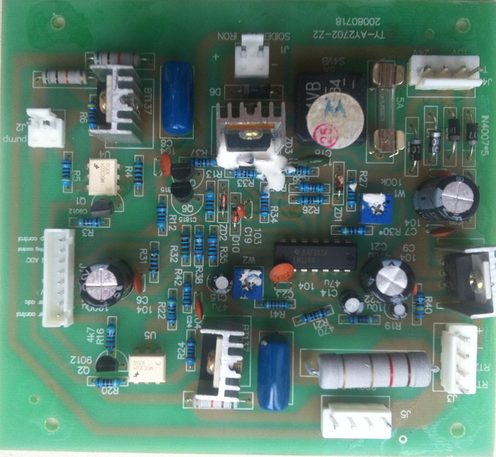 Когда собирал станцию решил питание делать на отдельных платах (т.к уже наступал на эти грабли)(это моя вторая станция на МК атмеги, на первой станции я полевик irfz44 поставил рядом с 358, откуда и были возбуды….и там показания до сих пор скачут, исправить не смог)……Питанием служит транс ТС-250-2П использую 2 обмотки-----1ю (19,2в 1,8А) на питание паяльника, вторую (6,8в) для цифровой части ((((питание цифровой части состоит из: диодного моста, кондер 0,1мкф, 7805, 470мкф и 0,1мкф----получаю 5в)))) ((((Плата питания паяльника состоит из : Диодного моста на 6А, кондер 0,1мкф,Irfz44, и кондера на 3300мкф))))………На лицевой плате разместил индикатор, МК, ОУ 358, кнопки, 2светодиода…Напряжение в сети от 222 до 226в..Паяльник Element 898, (пять штырьков), подходит для станции Baku 898d….