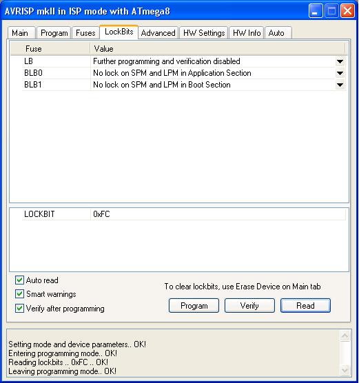 Блин, точно ведь, фьюз LB стоит значене "Further programming and verification disabled", я ведь и окно с лок битами сохранил Вроде при считывании ничего не ругалось Хорошо что не попробовал альтернативную прошивку в Atmega паяльника прошить и проверить работу . Ладно, вот с подогревным столом закончу, тогда и за ПС возьмусь.