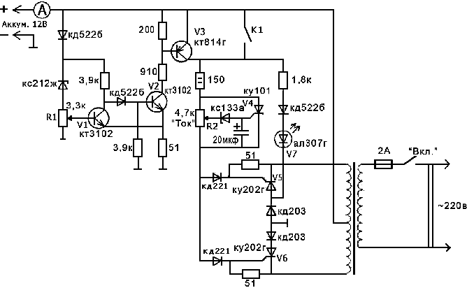 ps. При некоторых условиях, видных в программе, программа сама восстанавливает первые 4-е ячейки EEPROM. Однако, у меня оно по прежнему не работает. Точнее - начинает заряжать, стрелка амперметра дёргается и падает - всё! Если проэмулировать процессор замкнув то, что шло на 6-ю ногу Tiny на землю, то зарядник начинает заряжать - тиристоры работают. Светодиод моргает как будто аккумулятор только что зарядился - что говорит, о работе процессора в глубине программы.