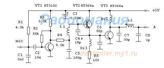 Собрал жучок по данной схеме. Не работает, т.е. не реагирует на внесение металлических предметов в катушке (не изменяется потребление тока) =( Микрофон от гарнитуры мобильника. Катушка 7 витков лакированного медного провода 0.5 мм диаметр 5 мм. Транзистор с непонятной маркировкой И (рисонок типа динамика) 8803 желтенький прямоугольной формы (отодрал от магнитофона-приставки маяк-233). R1=6.8 kOm R2=100 Om С1=0.1 (маркировка 104) С2=1nF (маркировка 102) С3=25p (маркировка 25 (надо 30p но не нашел может ли это как нибудь повлиять на работу жука?) С4=15p (маркировка 15) Сила тока в цепи 0.42 мА. Напряжение на транзюке Б-Э = 0.14В Б-К = 2.82В Э-К = 2.95В Тема про жука http://vrtp.ru/index.php?act=categories ... ticle=1681 http://vrtp.ru/index.php?act=categories ... ticle=1682