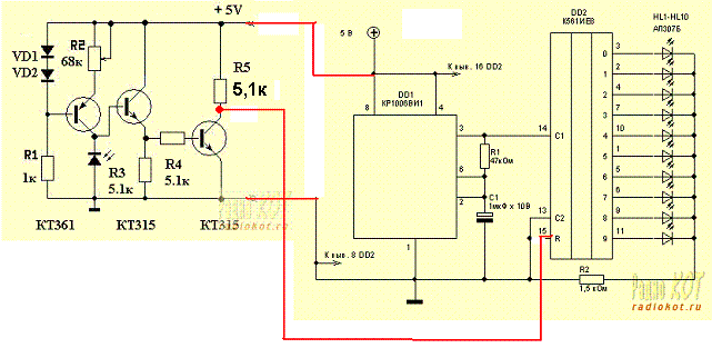 Сказанно что всесто светодиода можно поставить любую другую логическую схему. К примеру скажем как подключитт туда http://radiokot.ru/circuit/light/run/02/ вот такую схему?