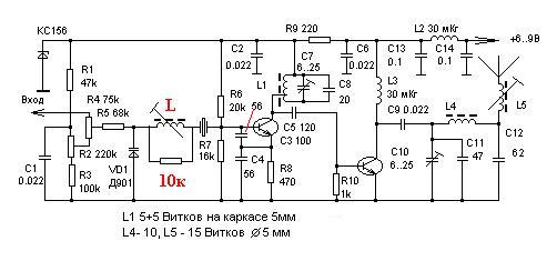 Можно их сбить подключив параллельно катушке резистор 5 - 10 ком и ещё попробовать увеличить индуктивность катушки. Снова появятся паразитные колебания или совсем сорвуться. Т.е. мы дойдём до максимума по уменьшению частоты. Теперь увеличиваем смещение на варикапе и смотрим, как частота будет увеличиваться. Следует учитывать, что ни о какой линейности модуляционной х-ки мы здесь не говорим. Применимо только в жучках. Разборчивость достаточна. При 20 мгц добивался изменения 20 кгц.