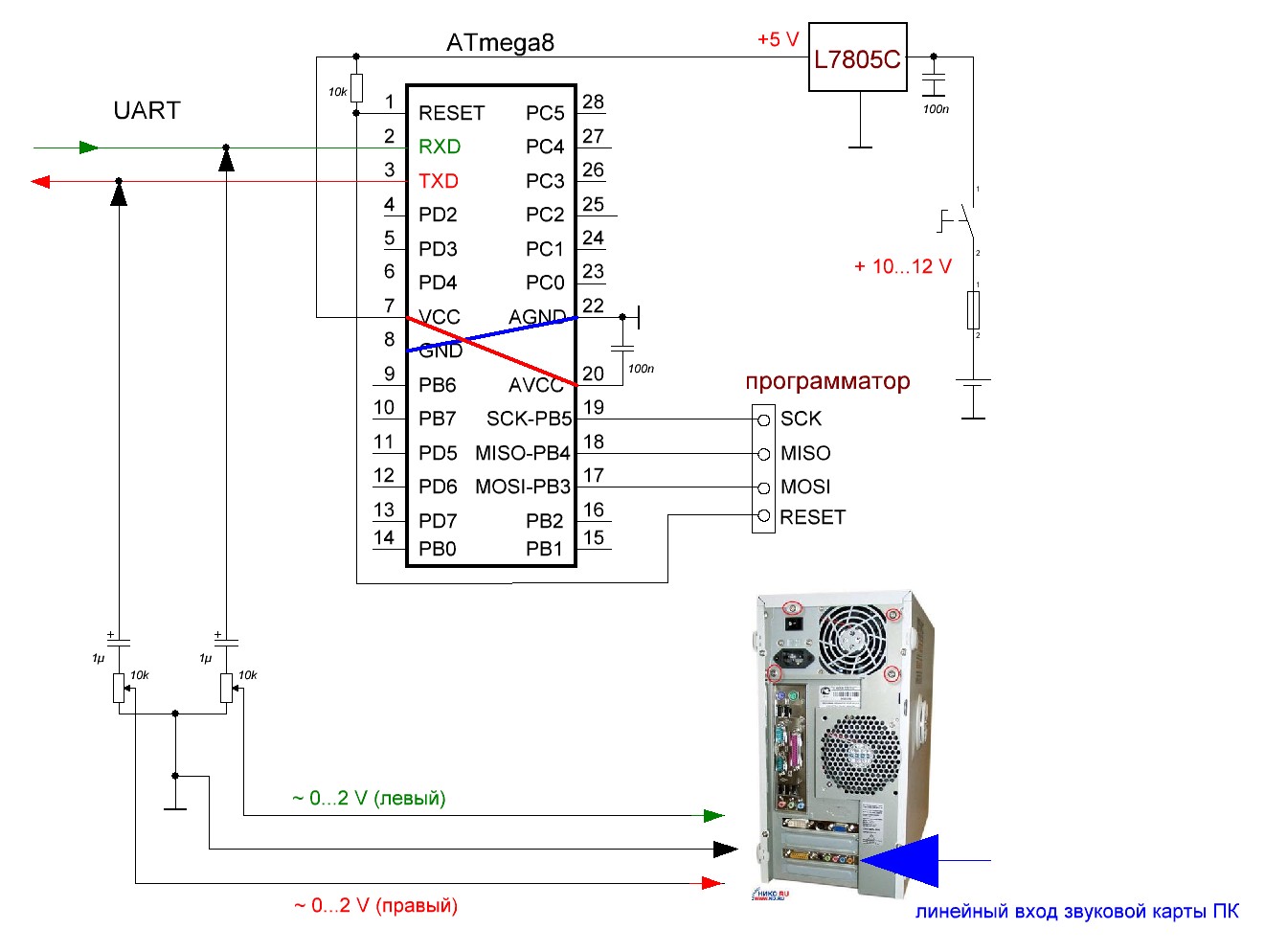 Вот архив программы самого простого осциллографа osc.rar Распакуйте в лубую папку... и наслаждайтесь))) Вот адаптер для компьютера. http://www.illari.ru/electro/osc/ Только я делаю проще: Можно поставить диоды в адаптер... чтобы случайно не спалить звуковую карту... А можно просто два переменных резистора... крутим на 1/3 ... короче чтобы на вход компьютера постыпало не более 2 вольт. Впринципе ничего страшного не будет если подать на вход ПК 5 вольт... но тогда мы не увидем импульсов т.к. при большом сигнале звуковая карта "перегружается"))) Да и не желательно подавать повышенное напряжение на линейный вход... ПК жалко ... Короче подключили к ПК, подкрутили резисторы и смотрим: