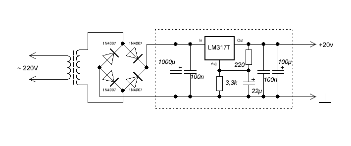 Компактный стабилизатор на LM317T, схема. Спойлер Внешний вид. Спойлер При указанных в схеме номиналах, выходное напряжение 20 вольт (питание фоно корректора, конструкция располагается во внешнем источнике питания). Печатная плата во вложении.