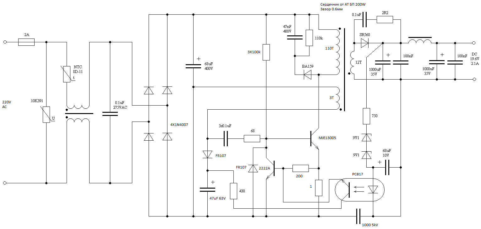 Получилось счесать сердечник. Трансформатор стянул без переточки, сердечник сел хорошо, плотно сомкнулся. Хочу вместо 13003 использовать с5027-r или 13007, или с4242. Склоняюсь к 5027, 3А - мне за глаза, и все-таки 800v, по сравнению с другими. Посоветуйте, какой лучше, нужно ли под них как-то адаптировать схему? Остановился на этой схеме, только входной фильтр сделаю как советовал Serj66610.