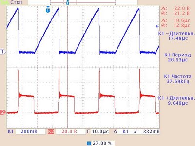 Комментарий к файлу: Вверху - ток коллектора, внизу - напряжение на коллекторе. TEK00000.jpg [24.28 KiB]