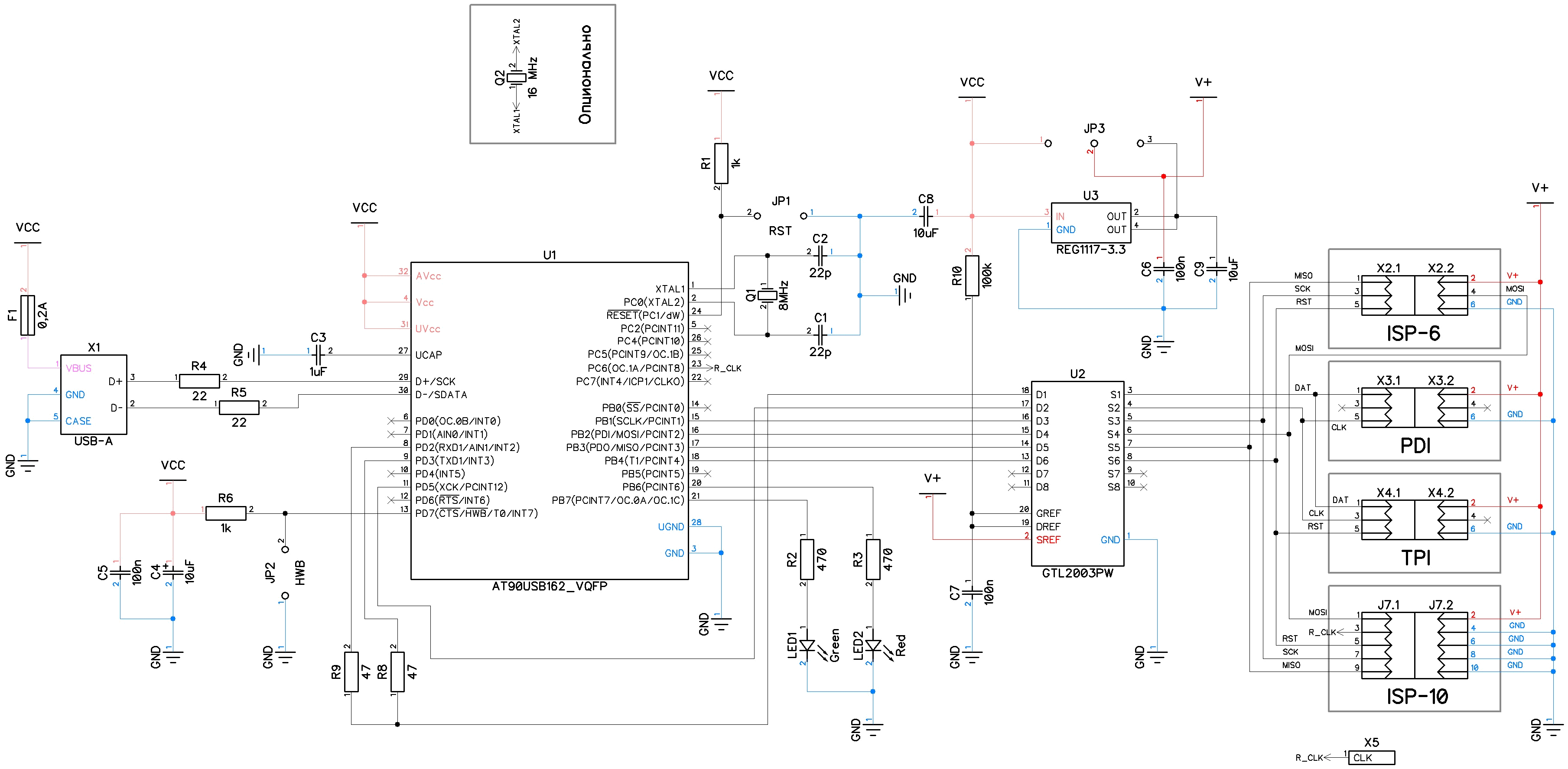 PS нашел почему то не в данной теме, а на другом ресурсе. быстрое переключение между USB-драйвером Jungo (который под Windows в составе AVR Studio) и LibUSB (через который под Windows работает AVRDUDE). Двойное мигание светодиодами при сбросе покажет, что работает драйвер Jungo, а если было четыре вспышки, то активен драйвер LibUSB.