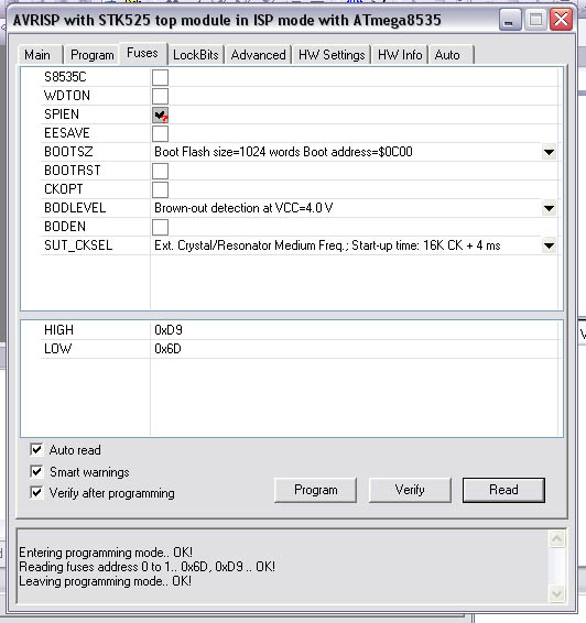 С фьюзами всё мрачно, видимо програматор собирают програмисты и сами могут поставить, а оригинальный собран на 90s8535 у которого и фьюзов то нет. Если что можно поиграться с битом S8535C . Мне достался контролер который вовсе и не мега, долго пытался дудкой шить фьюзы на что она матюкалась что не может, потом решил просто включить и заработало. Есть несколько скринов фьюз, они у всех разные, я так понял ставим внешний кварц остальное пофигу