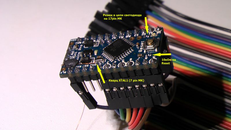 1. Выпаять подвязку RESET 10кОм к VCC 2. Выпаять 1кОм в цепи светодиода пина D13 платы (возможно и не надо). 3. Припаять вывод XTAL1 к кварцу (7 pin МК) или проводком с игогкой удерживать.