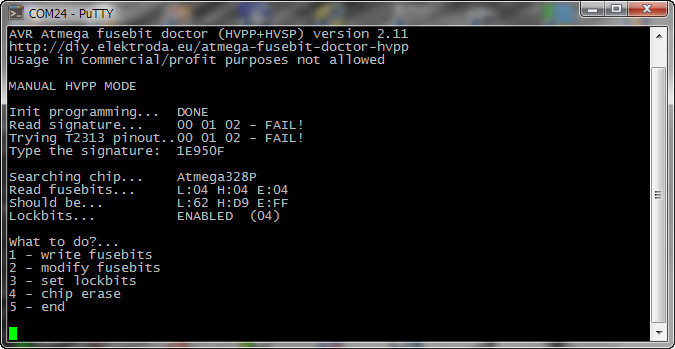 Welcome AVR Atmega fusebit doctor (HVPP+HVSP) version 2.11 http://diy.elektroda.eu/atmega-fusebit-doctor-hvpp Usage in commercial/profit purposes not allowed