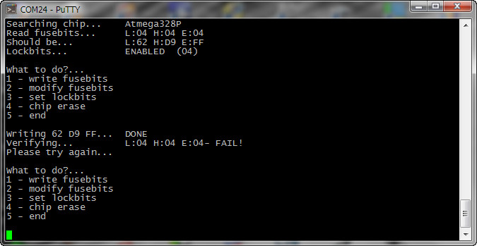 Init programming... DONE Read signature... 00 01 02 - FAIL! Trying T2313 pinout..00 01 02 - FAIL! Type the signature: 1E