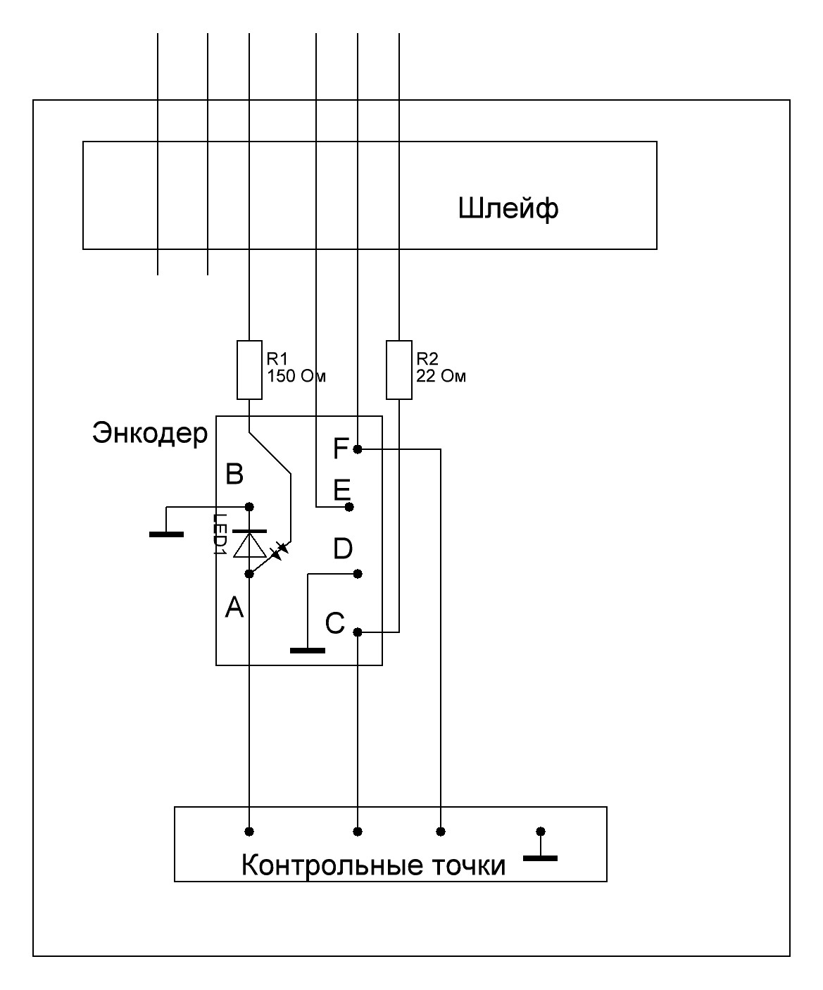 Добрый день. Помогите определить выводы энкодера. На рисунке плата энкодера от принтера. Выводы A и B это светодиод. Вывод C, который идет на шлейф через резистор 22Ом его подключать к 3,3В, а E и F это ENC0 и ENC1? Или F и C это выходы?