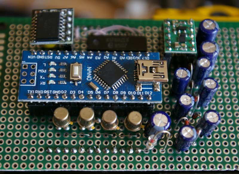 Икра заморская... тфу, часы "Ардуинистые". Правда, еще не припаял кнопки и резисторы противозасветные. При таком солнце не вижу, есть засветка или нет. Может вечером допаяю. Без моточных деталей. Сплошь из китайских модулей, горсточки транзисторов, диодов и толпы конденсаторов. Схема и софт взяты с интернета про часы на ИН-12. Взамен 155ИД1 поставил 176ИД3, и взамен высоковольтного преобразователя поставил модуль pololu DRV8838, на который нацепил конденсаторы, чтобы получить накал и анодное. Вот, накидал схему: