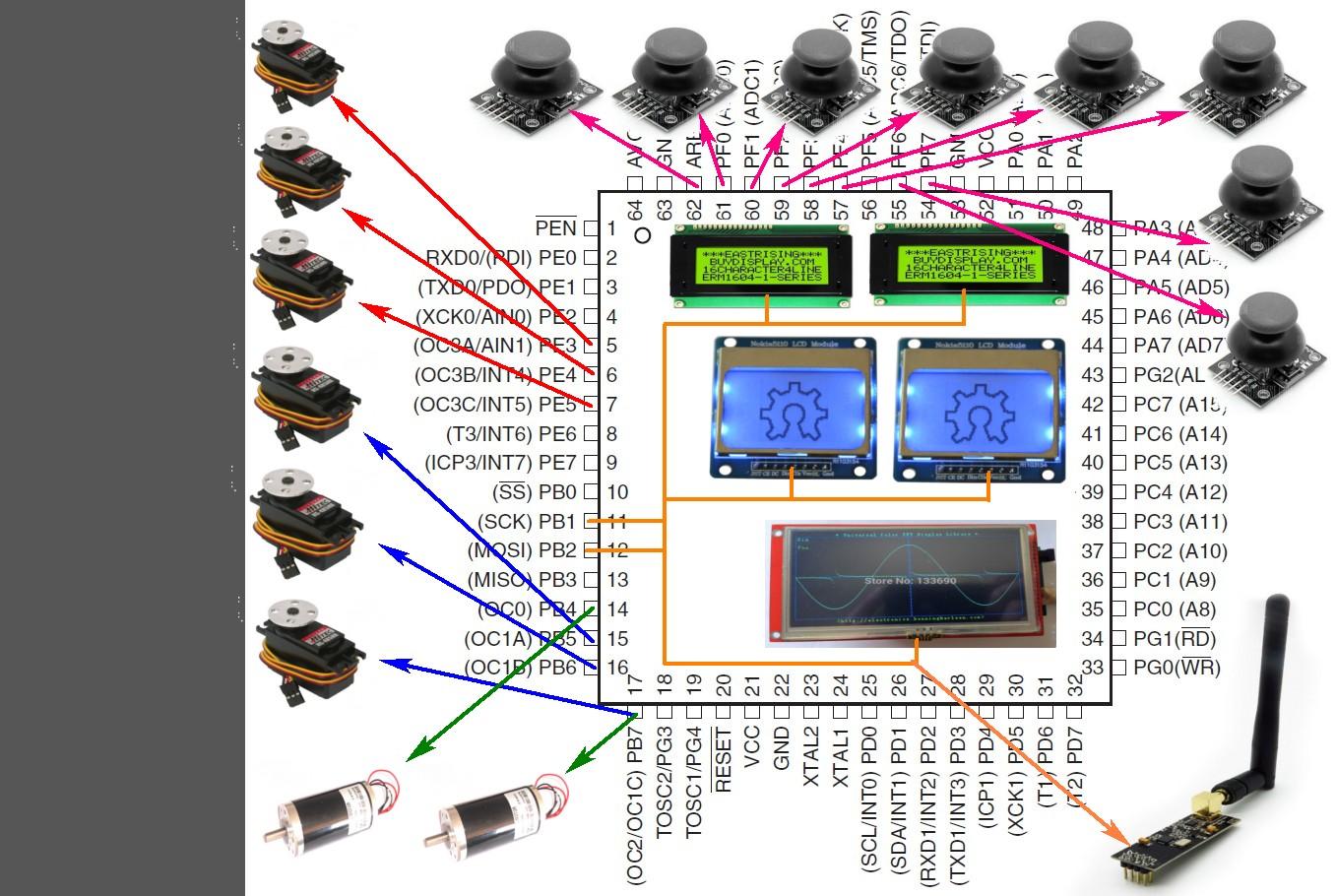 Меня все устраевает в управлении,модуль карабля не трогаем вобще там все хорошо(оставляем печатку и мегу Ну а пульт меняем все схему,печатку,микросхему так чтоби память,и портов било с запасом микросхему паяем в дип адаптер ну а дип адаптер на макетную плату задействуя нужные штирьки (тем самым можно что угодно менять не переделивая плату) атмега 128 на тао бао 0.6дол я заказал пару буду делать gsm сигналку в гараж нашол один заманчивый проект от туда и екран ST7920 4дол Придлагай любой екран большой,простой,недорогой,чтобы тебе било просто ево внедрить,екран от нокии очень маленький Я хочу чтобы на екране было много места+возможность графики например рисунок караблика,самальота,квадрика,машинки,сигнализатора и каждый режим со своими настройками и это все изменялось в меню пульта(шим,угли сервы,кнопки,итд итп+микросхему времени) Радио модули работают прекрасно,и вобще без збоев как в цэлом и алгоритм програмы ,стики для управления очень удобно и практично На левом стике вперет и назат+переключ батареи на правом лево право пигруз(туда на одной батарейке назат на другой)гдето десять рыбалок друганы в шоке проблем никаких удобно практично ну и дешыво с выгрузкой тоже проблем нету,драйвер на релюхе тоже норм но только транзистор поставим мосфет чтобы отыграть пропавший вольт Предлагай микросхему и екранчик будем делать круче чем у всех остальных похожых проэктах,самое главное чо у нас есть обкатаный алгоритм в реальных условиях чего нету у остальных