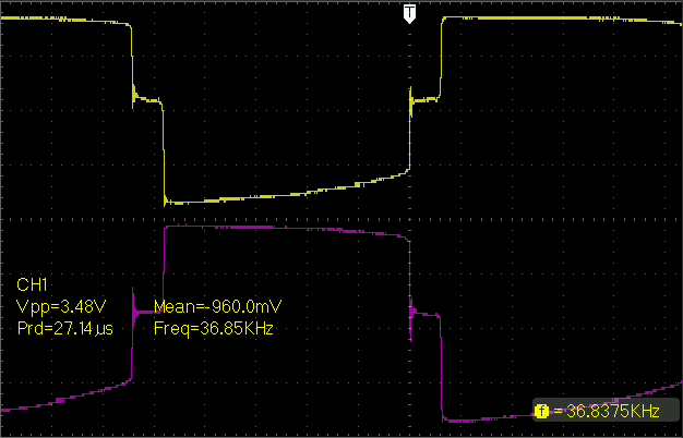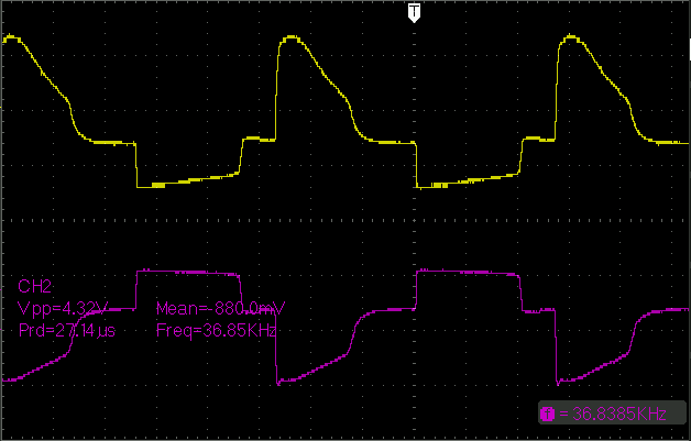 Это картина на R22 и R23. Без высоковольтного напряжения. ШИМ запитана от отдельного источника. Плюсы осциллографа на базах ключей.