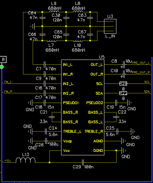 Доброго времени суток. Хочу сделать усилитель с ФМ-приемником на RDA5807M, темброблоком на TDA8425 (как раз два стереовхода, линейный, и ФМ), дополнительным усилителем для наушников на AD8397, а с оконечным каскадом еще не решил, что поставить. Управлять всем будет микропроцессор с TFT-дисплеем. На данный момент первая плата (без УНЧ, только ТДА, процессор, ФМ-модуль и дисплей) уже работает. Затруднения у меня возникли со схемой УНЧ для наушников и ОУ для индикации уровня сигнала на дисплее. Вот предварительно нарисовал схемы, подскажите что где не так. J3 это разъем для наушников с дополнительным контактом, чтобы отключить оконечный УНЧ колонок. АЦП процессора до 3,3в, поэтому питание LM358D от 3,3в. Как я понимаю, чтобы правильно измерять синусоиду, на АЦП должно быть половина напряжения питания, и на выходе LM358 как раз будет половина питания без сигнала?