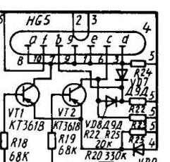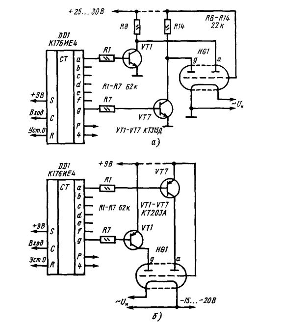 Подскажите кто в курсе: Есть часы Электроника Б6-403 на ИВ-12 ключи 161КН1 ( На КН1 (DD1 по схеме) погорел один из семи ключей (выводы 4 и 14) и один сегмент на ИВ12 не работает (на выходе ИЕ4 напряжение меняется 0 и 9В, а на выходе КН - тишина на лампе минус 3В), вряд ли найду в скором времени донора КНок, а пока хочу заменить только неработающий ключ транзистором, нашел в книге Бирюкова С.А как заменить КН, но какую схему использовать ума не приложу а) или б).