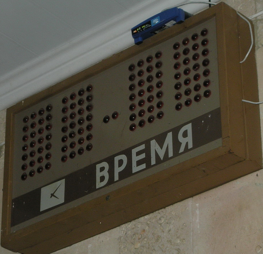 Про часы мне тоже жалко, что не работают. Сфоткал я их в одном из корпусов моего универа, там есть еще одни такие , тоже не рабочие. Всего же по разным корпусам я насчитал 5 "Электроник 7" Из них работают 4, у 3-х-- негорит около 40% точек, и лишь одни почему-то как новые : горят все точки, время читается нормально, и показывают они его правильно. По моему идея "публичных" часов в людных местах потеряла свою актуальность: у многих мобилки, конечно с часами, или наручные часы.